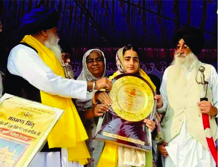 ਪੰਜਾਬੀ ਯੂਨੀਵਰਸਿਟੀ ਚੰਡੀਗੜ੍ਹ ਦੀ ਵਿਦਿਆਰਥਣ ਹਰਮਨਪ੍ਰੀਤ ਕੌਰ, ਜਿਸ ਨੇ ਡੱਟ ਕੇ ਪੁਲਿਸ ਮੁਲਾਜ਼ਮ ਨੂੰ ਕਿਹਾ ਸੀ “ਛੱਡ ਮੇਰੀ ਬਾਂਹ ਨਹੀਂ ਤਾਂ ਆਪਣਾ ਸੋਚ ਲਈਂ”, ਨੂੰ ਦੀਨਾ ਕਾਂਗੜ ਦੀ ਇਤਿਹਾਸਕ ਧਰਤੀ ’ਤੇ ਸਰਦਾਰ ਸਿਮਰਨਜੀਤ ਸਿੰਘ ਮਾਨ ਅਤੇ ਅਕਾਲੀ ਦਲ ਅੰਮ੍ਰਿਤਸਰ ਵਲੋਂ ਮਾਈ ਭਾਗੋ ਐਵਾਰਡ ਨਾਲ ਸਨਮਾਨਿਤ ਕੀਤਾ ਗਿਆ।